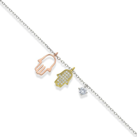 Sterling Silver 925 Tri-Tone Hamsa Hand Bracelet - FKJBRLSL2294